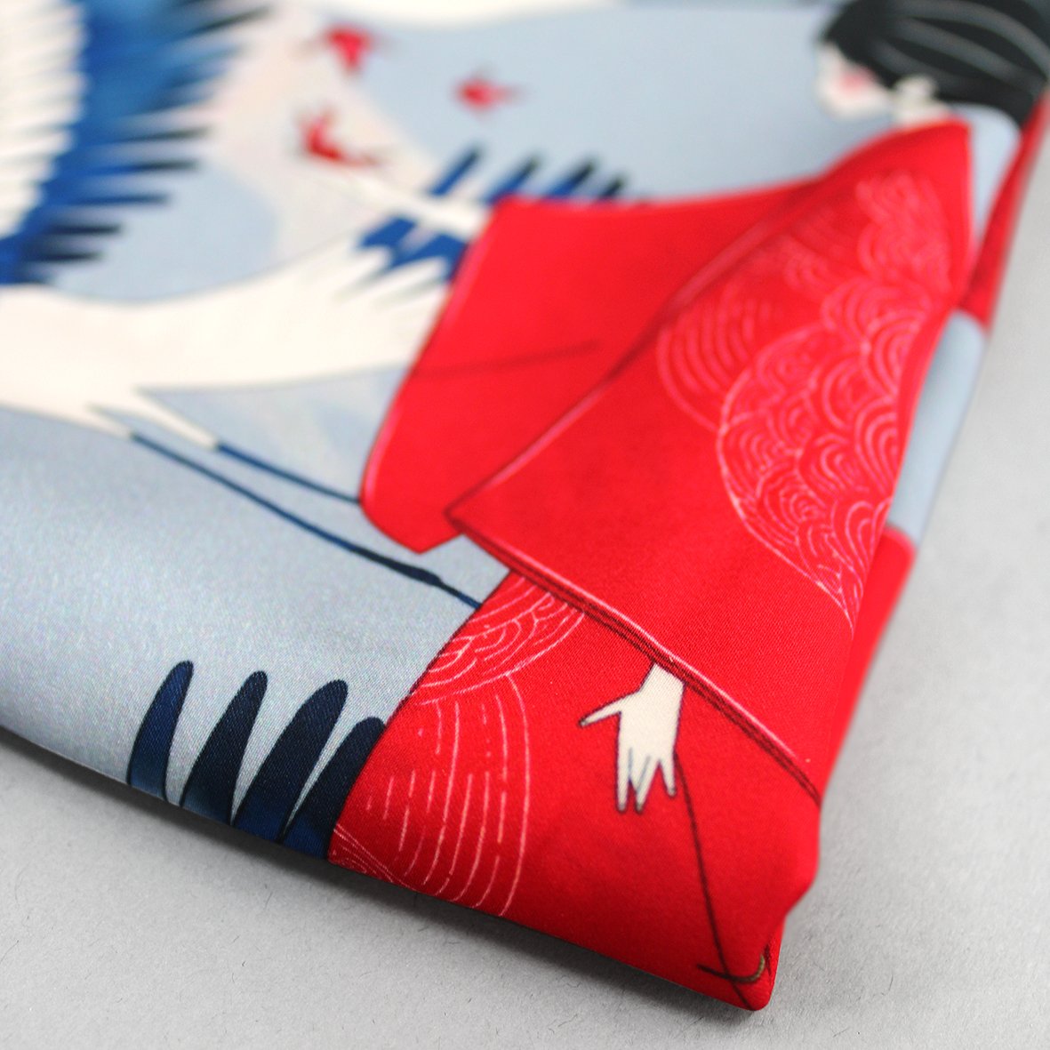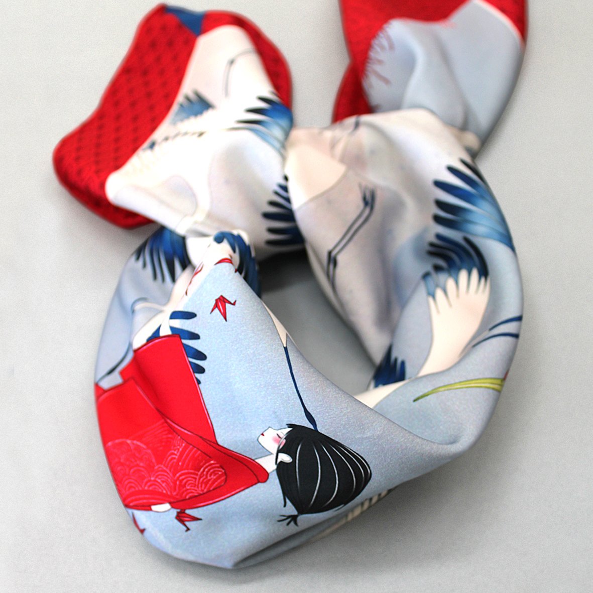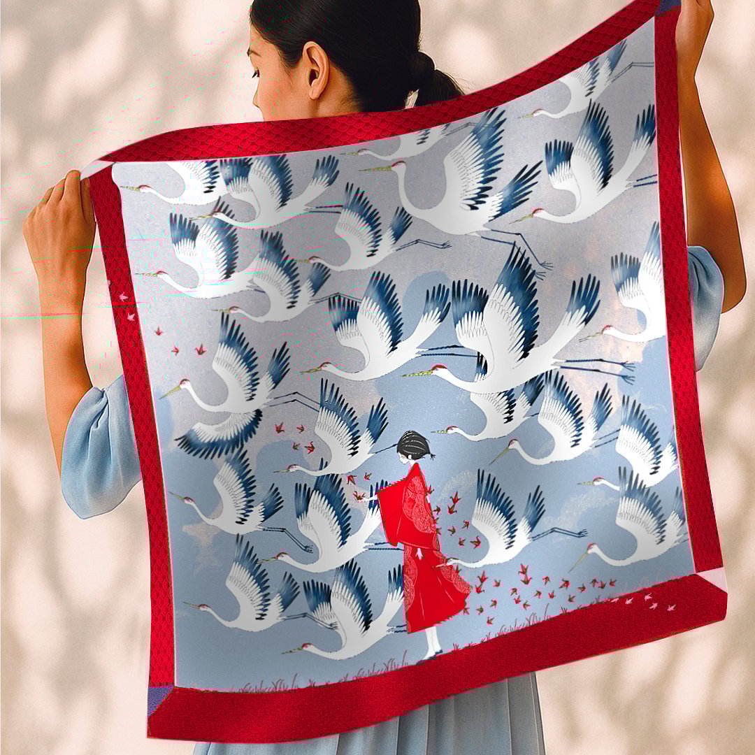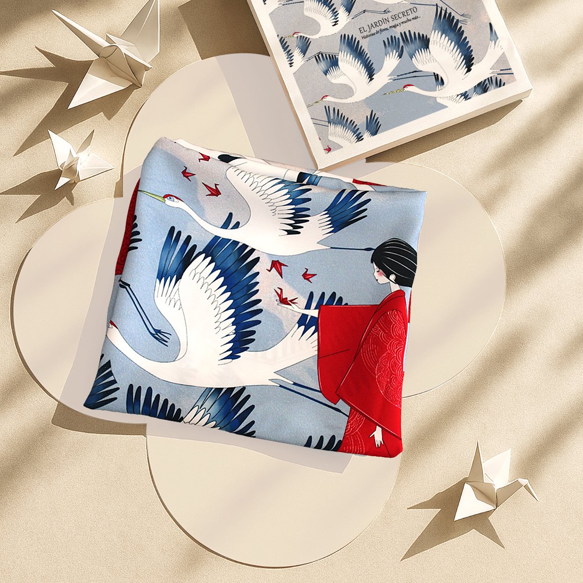 Este pañuelo nace inspirado en la antigua leyenda japonesa de Sadako y las mil grullas, símbolo de esperanza, fortuna y renovación interior.